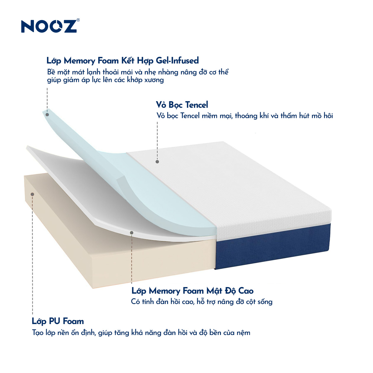 Mỗi dòng Nệm NOOZ đều có khả năng đáp ứng nhu cầu sử dụng khác nhau, đảm bảo mang lại giấc ngủ thoải mái và hỗ trợ tốt nhất cho cơ thể bạn suốt đêm dài.