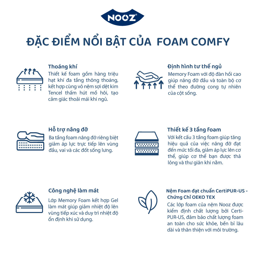 Nệm Foam Comfy 25cm và Nệm Foam NOOZ khác nhau chủ yếu ở cấu trúc và tính năng hỗ trợ. Nệm Foam Comfy 25cm được thiết kế với 3 lớp foam, bao gồm lớp Memory Foam kết hợp Gel-Infused giúp bề mặt mát lạnh và nâng đỡ nhẹ nhàng, lớp Memory Foam mật độ cao cung cấp độ đàn hồi cao để hỗ trợ cột sống, và lớp PU Foam tạo nền ổn định, tăng khả năng đàn hồi và độ bền của nệm. Trong khi đó, Nệm Foam NOOZ có thiết kế đơn giản hơn, tập trung vào việc cung cấp độ mềm mại và đàn hồi vừa phải để đem lại sự thoải mái cơ bản khi nằm.