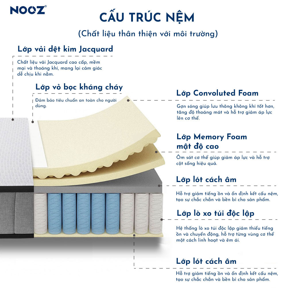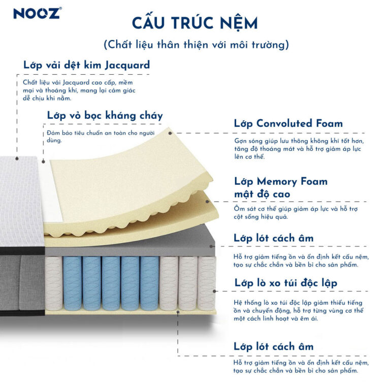 Nệm NOOZ có cấu trúc bao gồm nhiều lớp, và mỗi loại nệm sẽ có cấu trúc và trọng lượng khác nhau. Dưới đây là những chỉ số cho từng sản phẩm mà bạn có thể tham khảo lựa chọn: